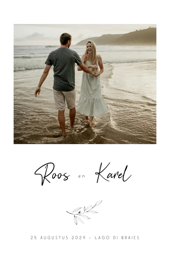 Mediterraanse trouwkaart met een olijftakje en een persoonlijke foto op de voorzijde.