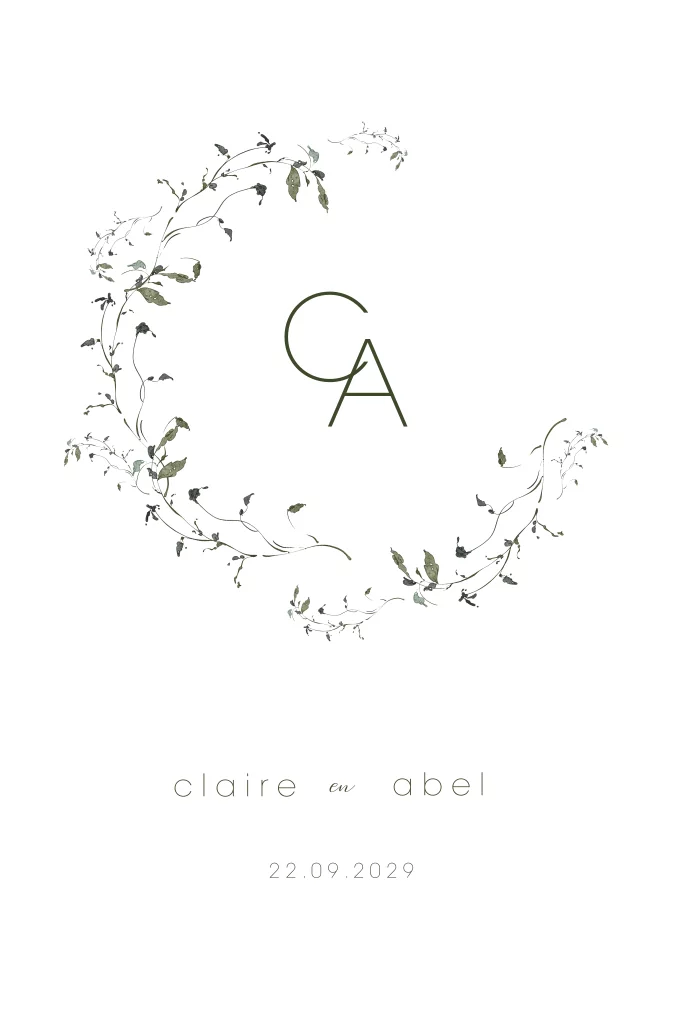 Unieke trouwkaart met initialen in een groene subtiele bladerkrans.