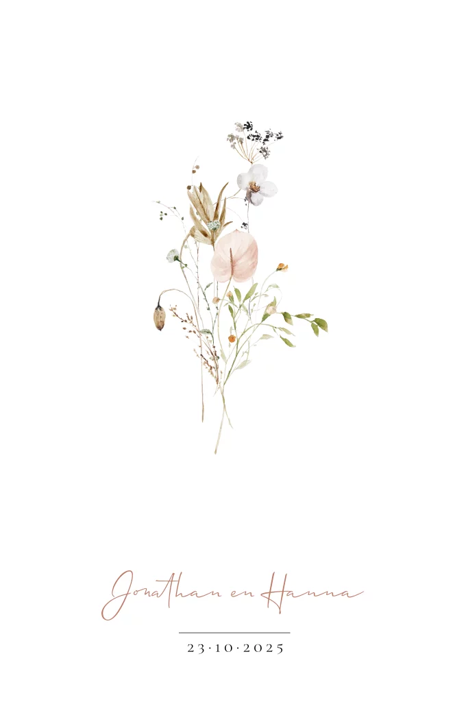 Trouwkaart met een prachtig minimalistisch boeket bloemen in pastel tinten.