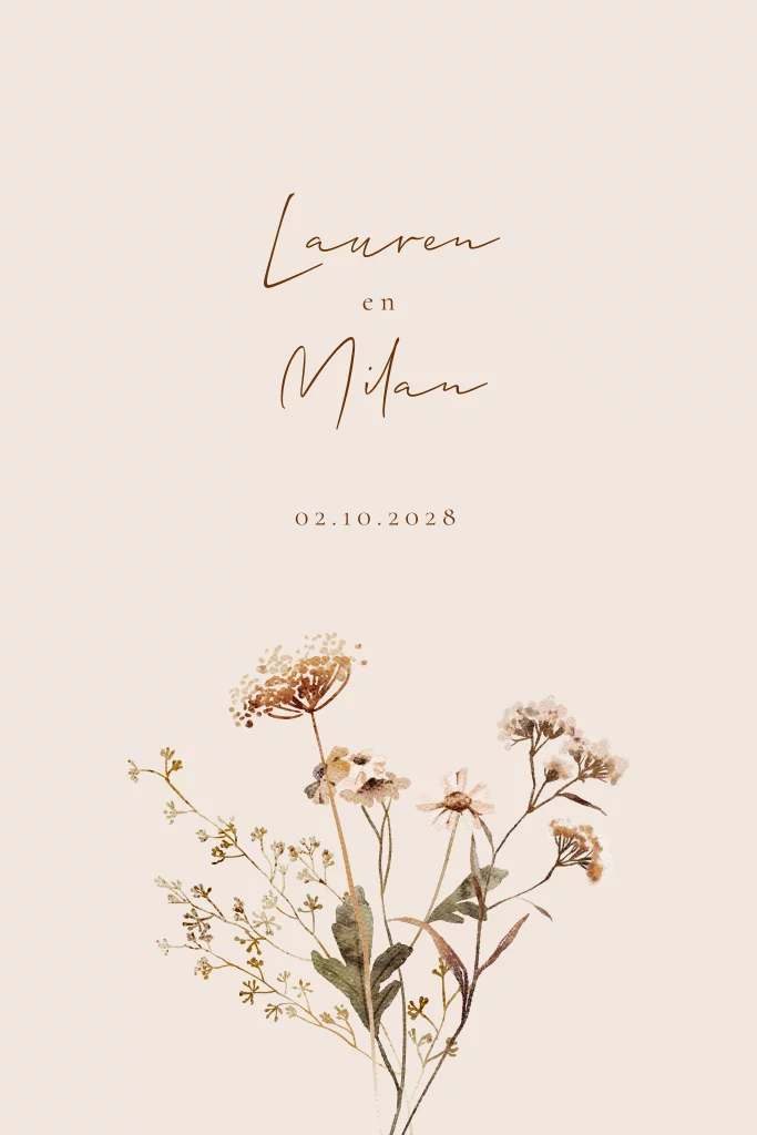 Een romantische trouwkaart poederroze achtergrond en een boeket met wilde bloemen.
