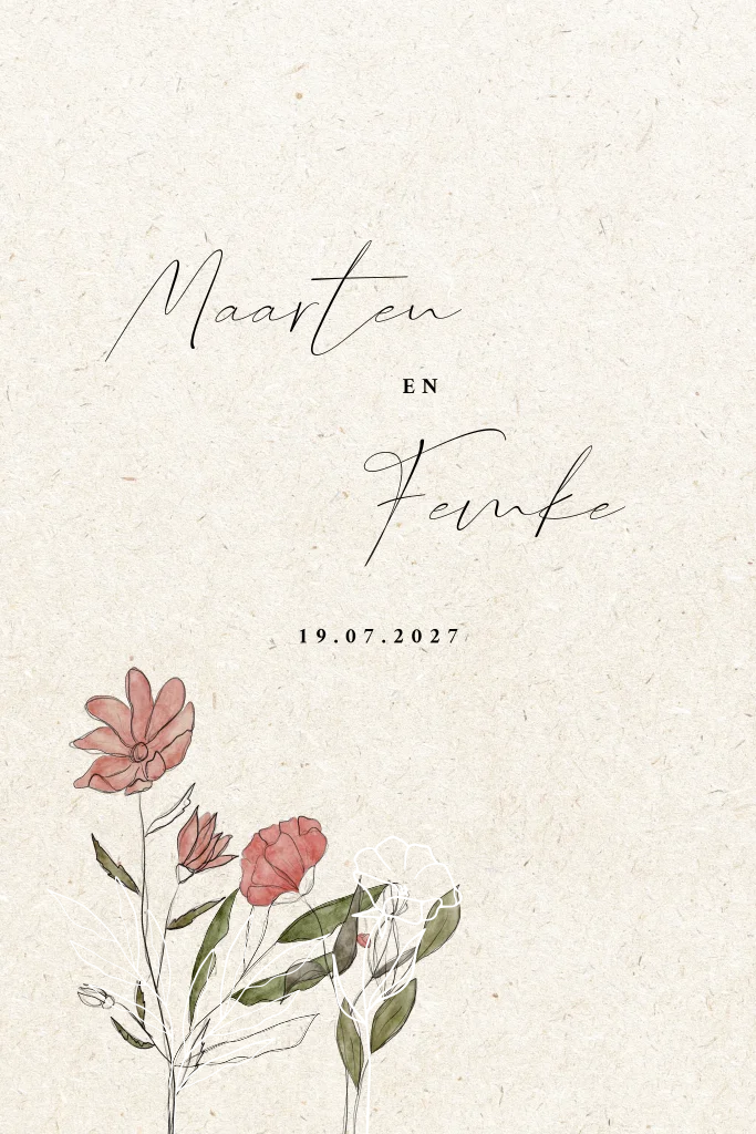 Een originele trouwkaart met vezel look achtergrond en prachtig geschetste bloemen in combinatie met bloemen in goudfolie. Bij dit kaartje adviseren we linnen papier.