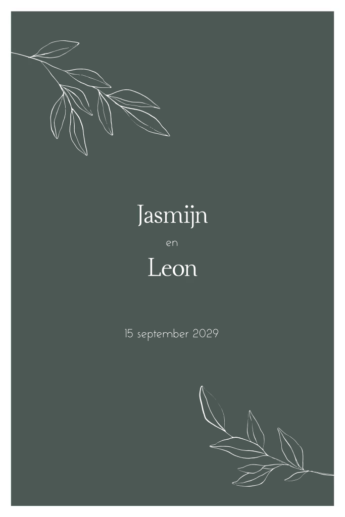 Romantische trouwkaart met warm groene achtergrond en goudfolie tekst, takjes en bladeren op de voorzijde.