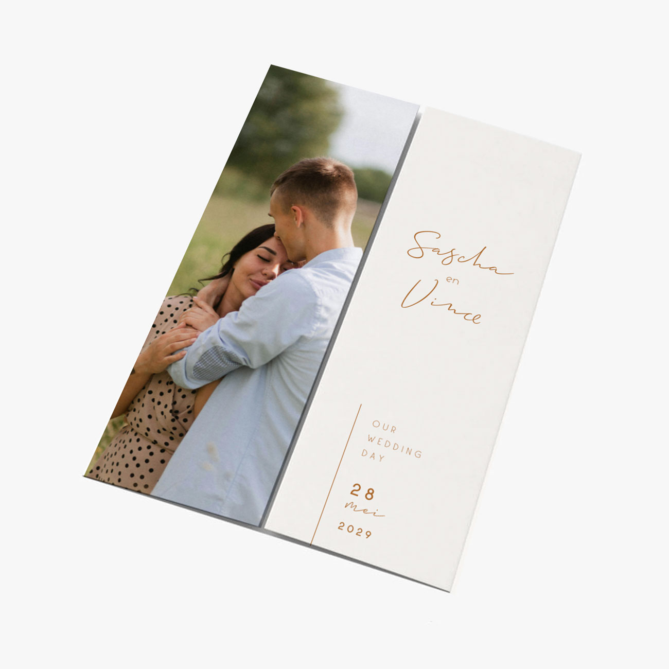 Deze tweeluik trouwkaart is de ideale kaart voor het toevoegen van een dagplanning en praktische informatie door middel van de tweeluik.