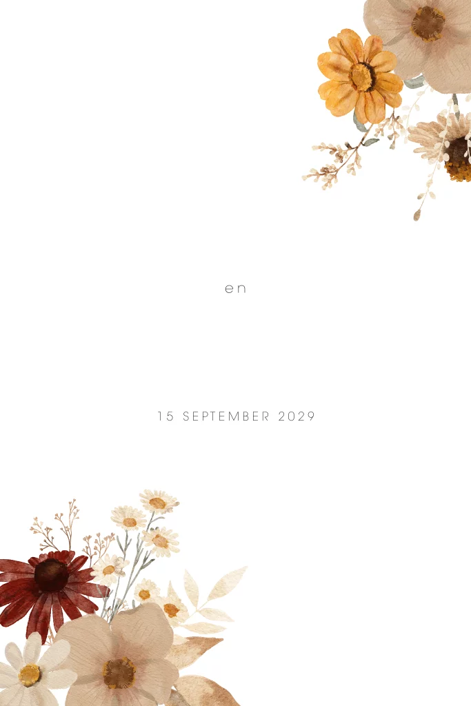 Romantische trouwkaart met bloemen in aardetinten en naturel tinten.