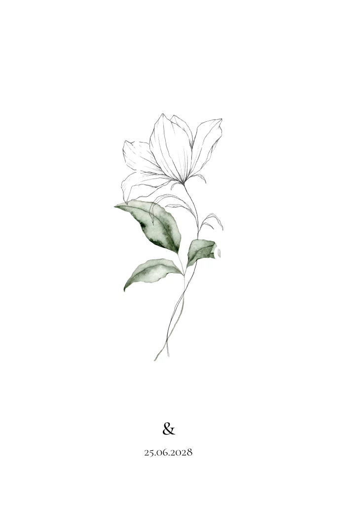 Een originele en romantische trouwkaart geschetste bloemen en watercolor groene blaadjes. De voorzijde is voorzien van goudfolie opdruk.