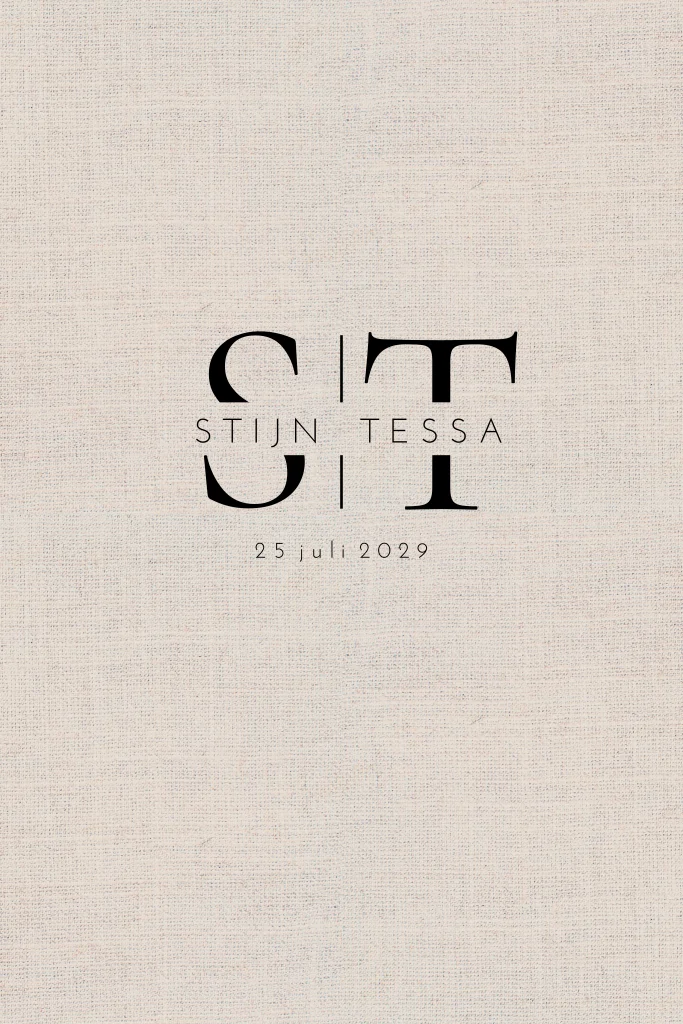 Moderne trouwkaart in zwart wit met de initialen van het bruidspaar. Op een linnen look achtergrond.