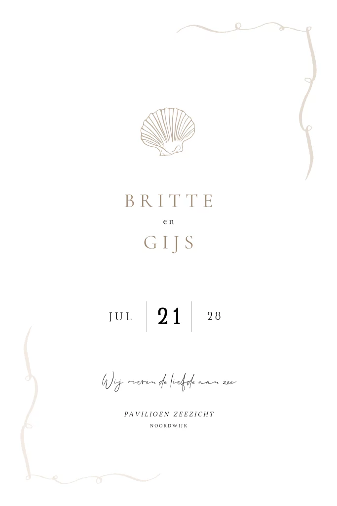 Trouwkaart voor een echte beach bruiloft. Deze strand kaart heeft zand en blauwe tinten en icoontjes van schelpen en golven. Perfect passend bij de zomerse Beach wedding!