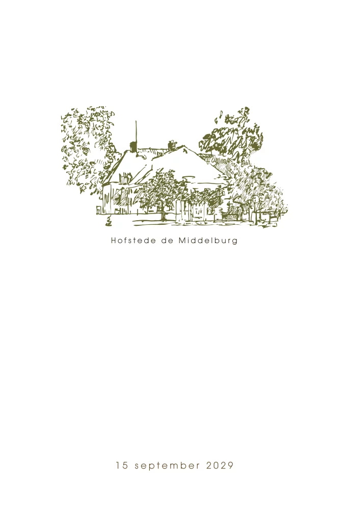 Romantische trouwkaart met een illustratie van trouwlocatie Hofstede De Middelburg in Bussloo.