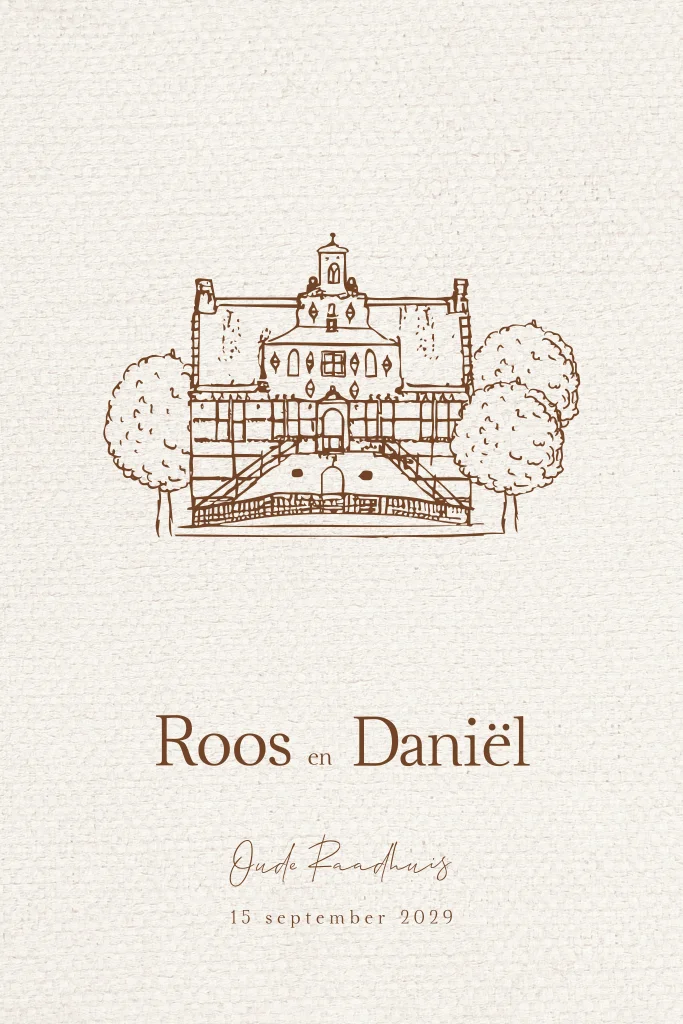 Romantische trouwkaart met een illustratie van trouwlocatie het Oude Raadhuis in Oud-Beijerland.
