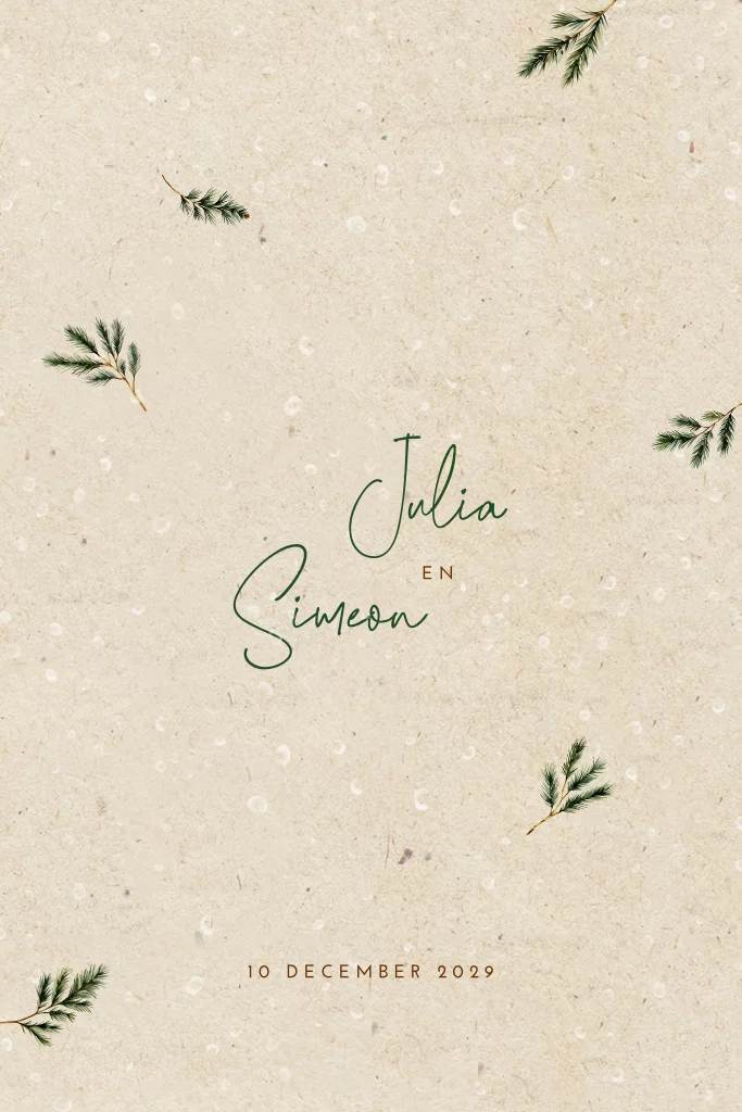 Een winterse trouwkaart met een fijne eco structuur achtergrond. Gecombineerd groene dennentakjes en hele lichte sneeuwvlokjes op de achtergrond. Deze kaart past goed bij de echte winter bruiloft.