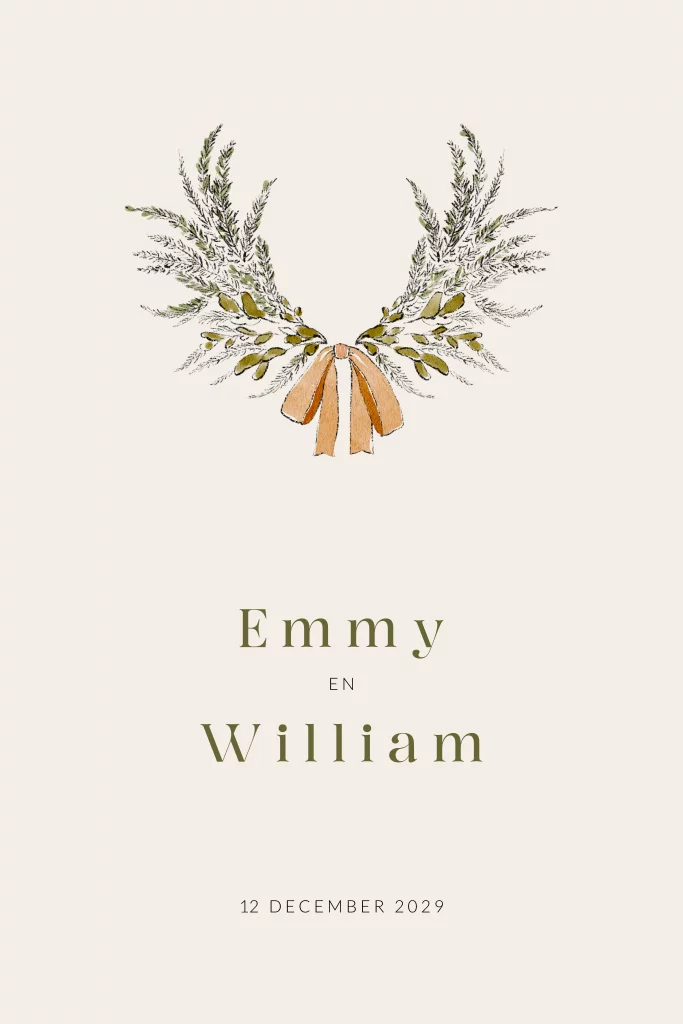 Winterse trouwkaart met krans vol kersttakken. Perfect voor de winter bruiloft.