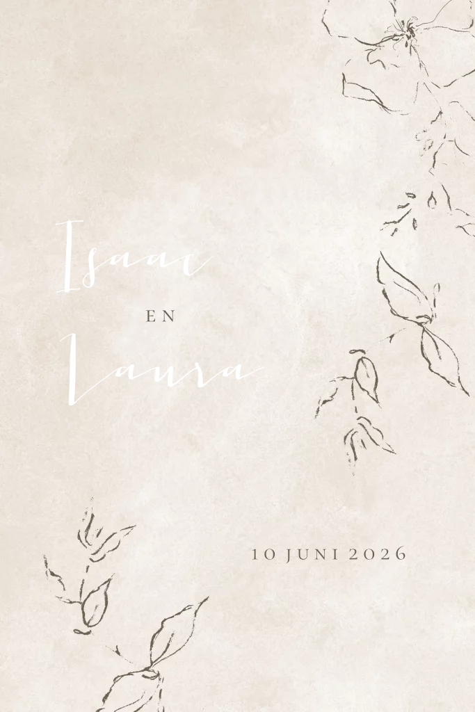 Trouwkaart in zandkleur met geschetste bloemen en goudfolie letters aan de voorzijde