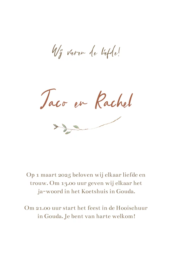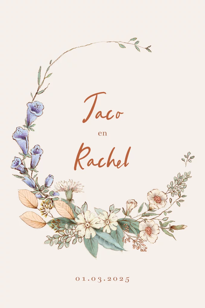Trouwkaart zandkleur met bloemenkrans