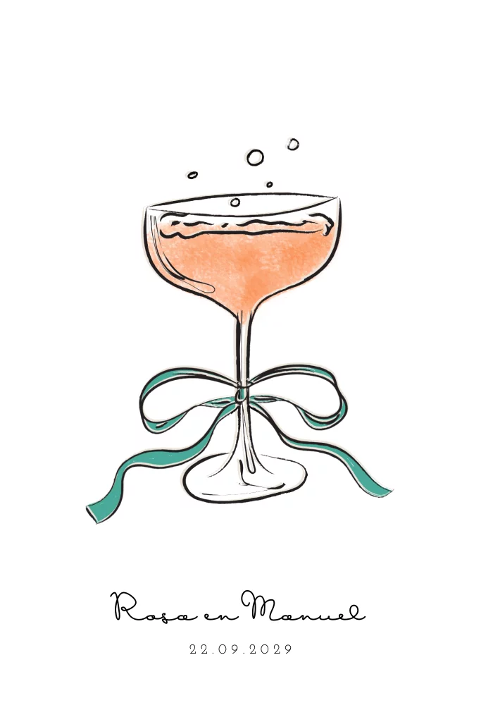 Hippe trouwkaart met champagne glas met strik. In vrolijke kleuren. Pas de kleuren eenvoudig aan in de online ontwerptool. De strik op de voorzijde is te verwijderen van het glas, indien gewenst.