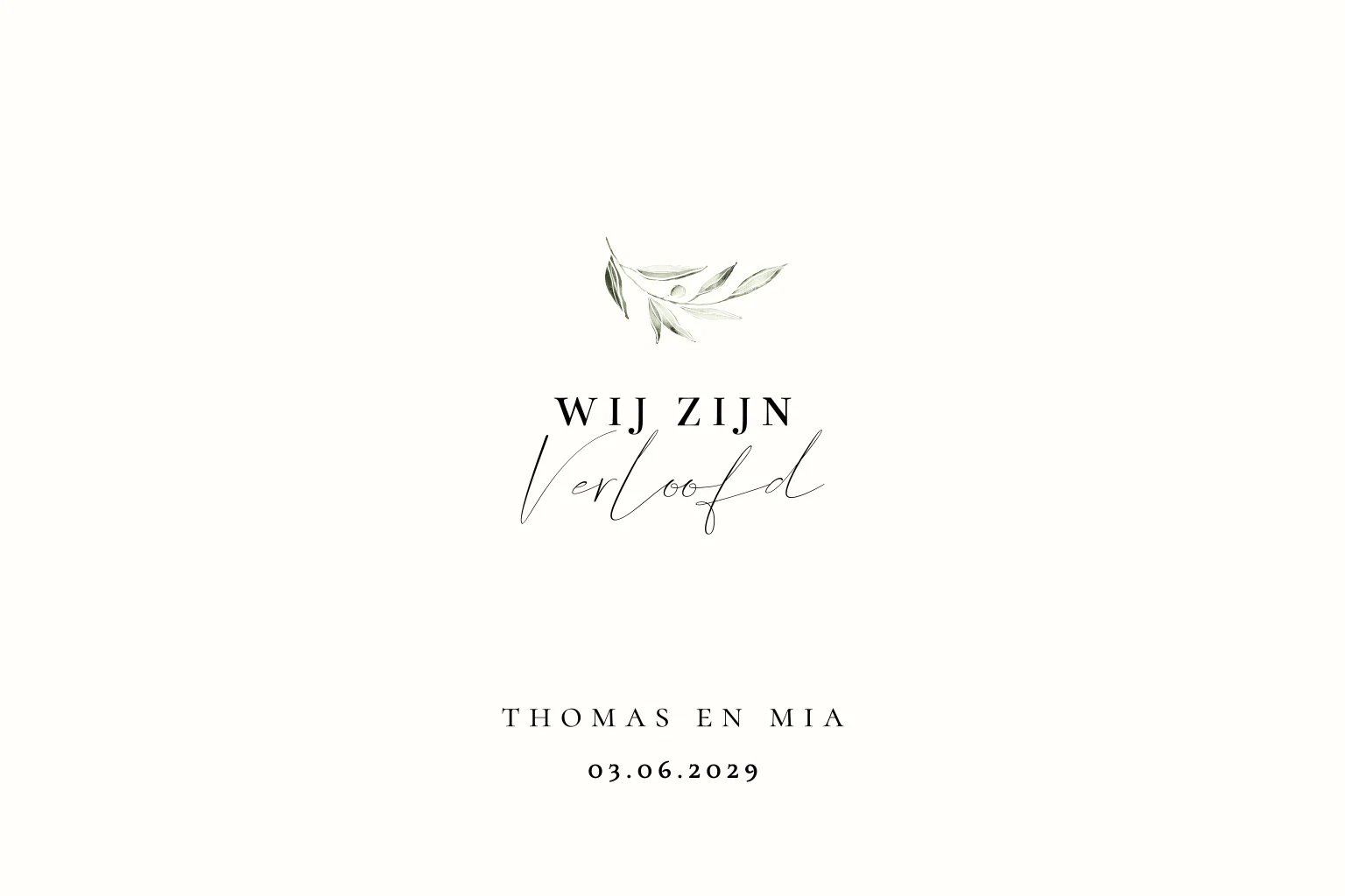 Een elegante verlovingskaart met een mediterrane sfeer. Het fijne olijftakje in goudfolie springt subtiel in het oog en geeft deze kaart een warme, luxe uitstraling. Rustig, verfijnd en helemaal van nu.