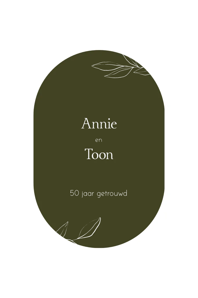 Romantische kaart voor een huwelijksjubileum met groene tinten en goudfolie voor tekst, takjes en bladeren op de voorzijde.
