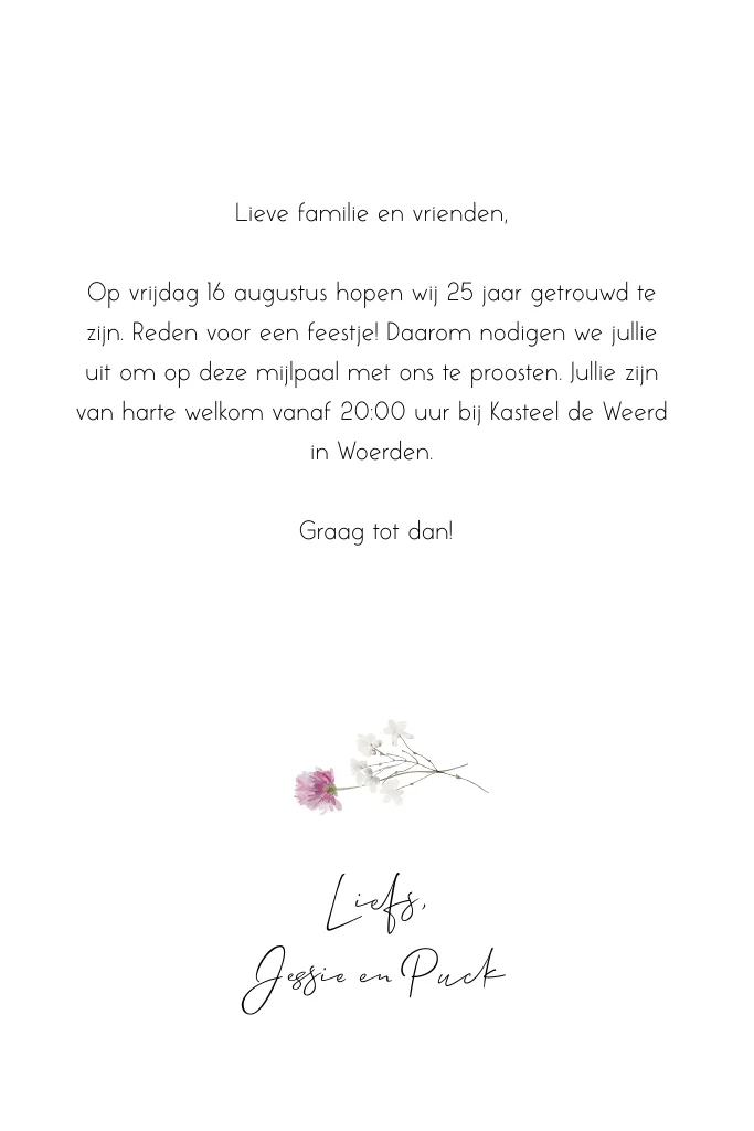 Vrolijke kaart voor een huwelijksjubileum met een kleurrijke bloemenkrans. Wijzig de foto eenvoudig naar jullie eigen foto via de online editor. Het aantal jaar van het jubileum kan naar wens worden aangepast.