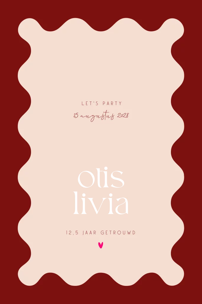 Een hippe uitnodiging voor het huwelijksjubileum. Perfect passend wanneer je bijvoorbeeld 12,5 jaar of 40 jaar getrouwd bent. Met golvende rand en hippe, kleurrijke bordeaux rood en roze kleuren. Maak indruk met deze originele kaart!