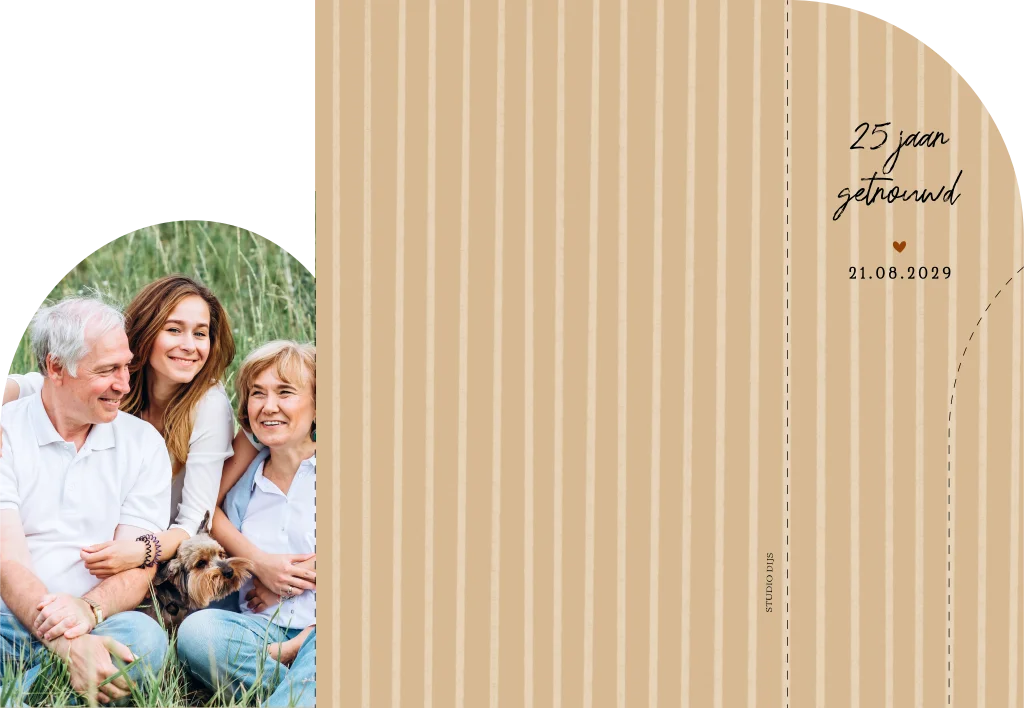 Stijlvolle jubileum uitnodiging voor een 25 jarig huwelijk met een tweeluik, zachte roze en beige tinten en ruimte voor een persoonlijke foto.