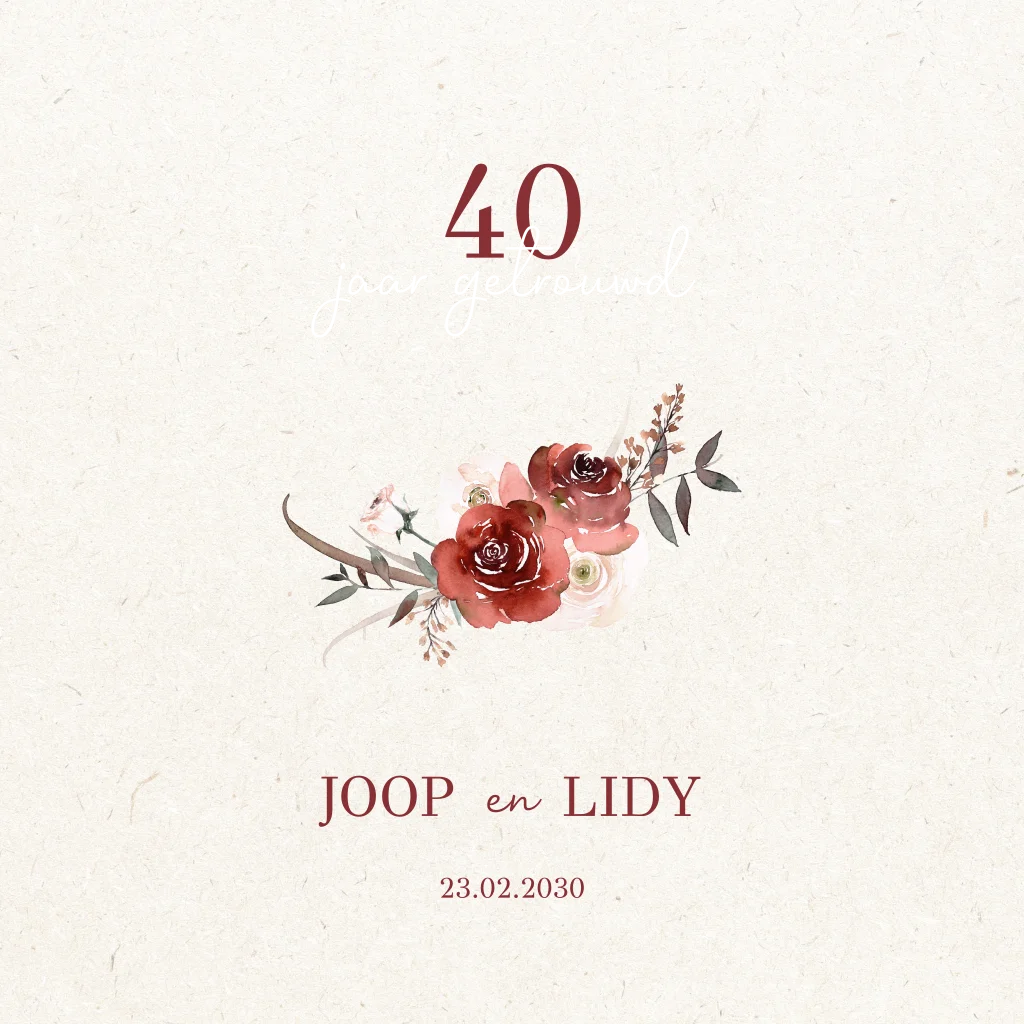 Vrolijke jubileum uitnodiging voor een 40 jarig huwelijk in warme rode tinten, met stijlvolle (goud)folie accenten en feestelijke bloemen.
