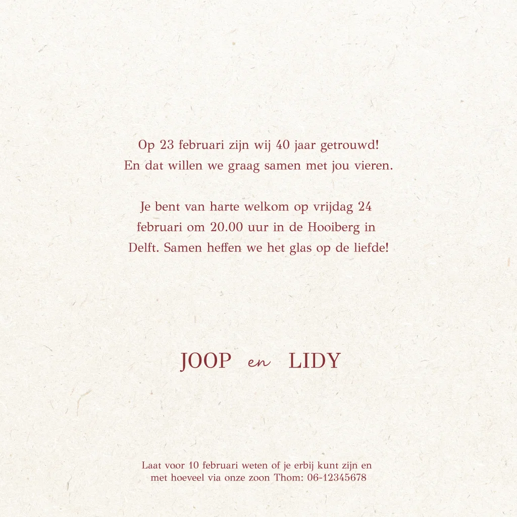 De tekst is eenvoudig aan te passen in onze online editor, zodat je de uitnodiging helemaal naar wens kunt maken.