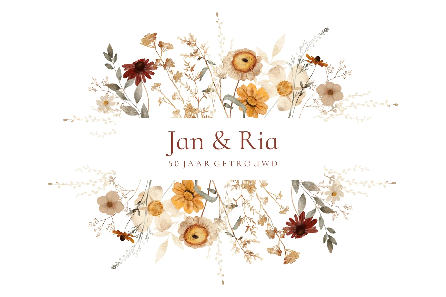 Vrolijke jubileumkaart voor een 50 jarig huwelijk met een natuurlijke eco look en bloemen in warme rode en gele tinten.