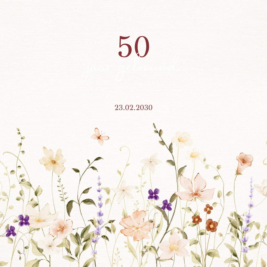 Stijlvolle jubileum uitnodiging voor een 50 jarig huwelijk met een natuurlijke linnen look en kleurrijke veldbloemen voor een vrolijke uitstraling.