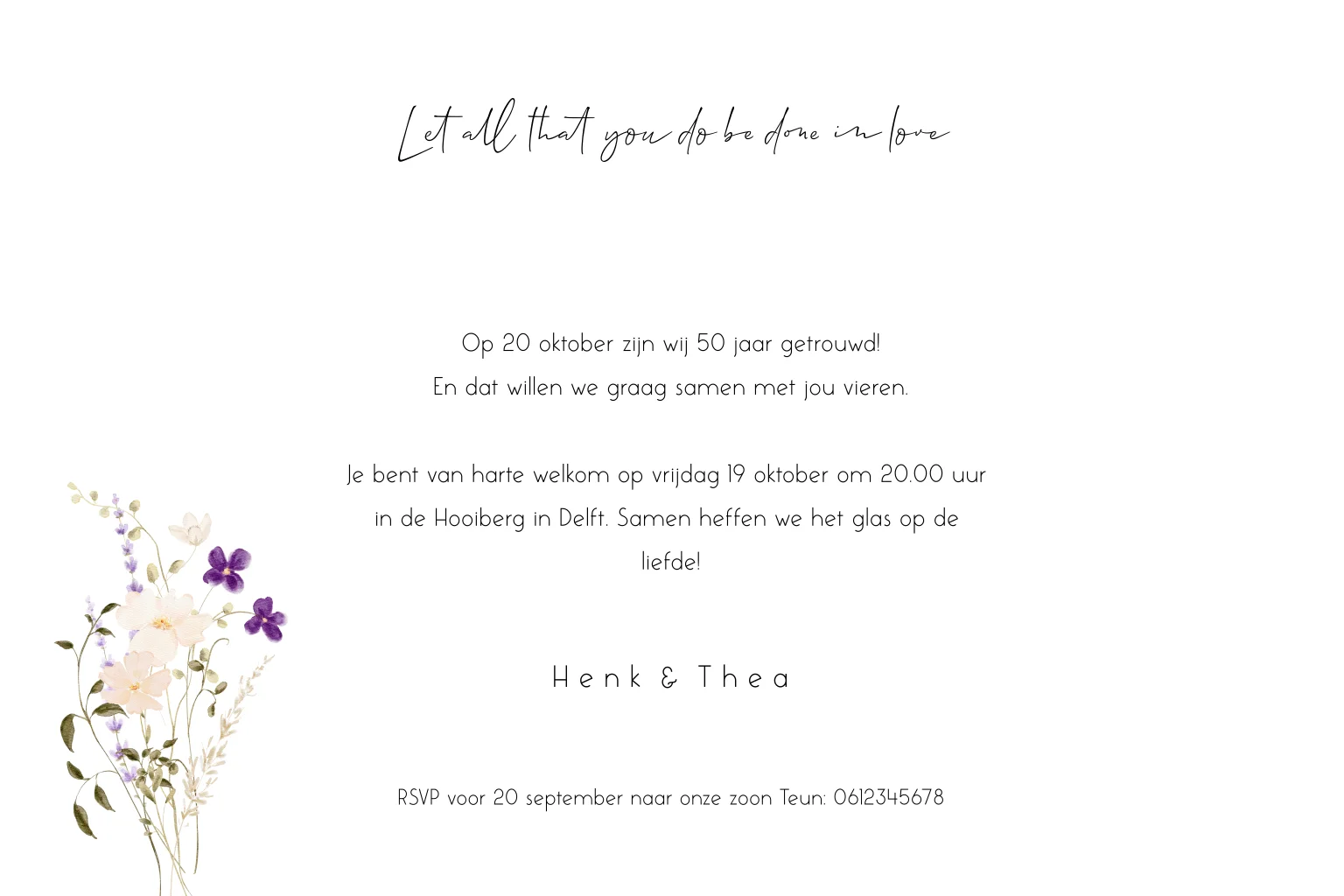 Vrolijke jubileum uitnodiging voor een 50 jarig huwelijk met kleurrijke veldbloemen en stijlvolle (goud)folie accenten.