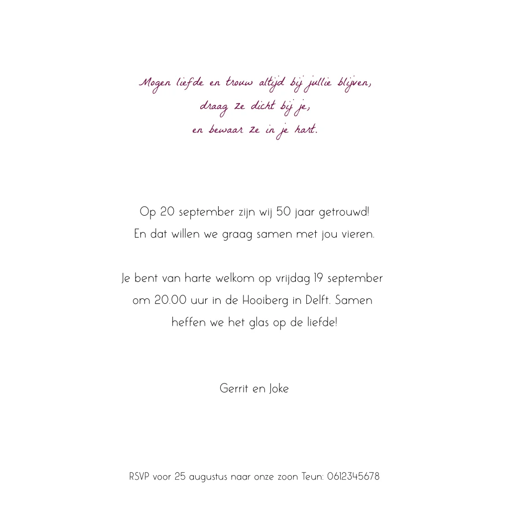 De tekst is eenvoudig aan te passen in onze online editor, zodat je de kaart helemaal persoonlijk kunt maken.
