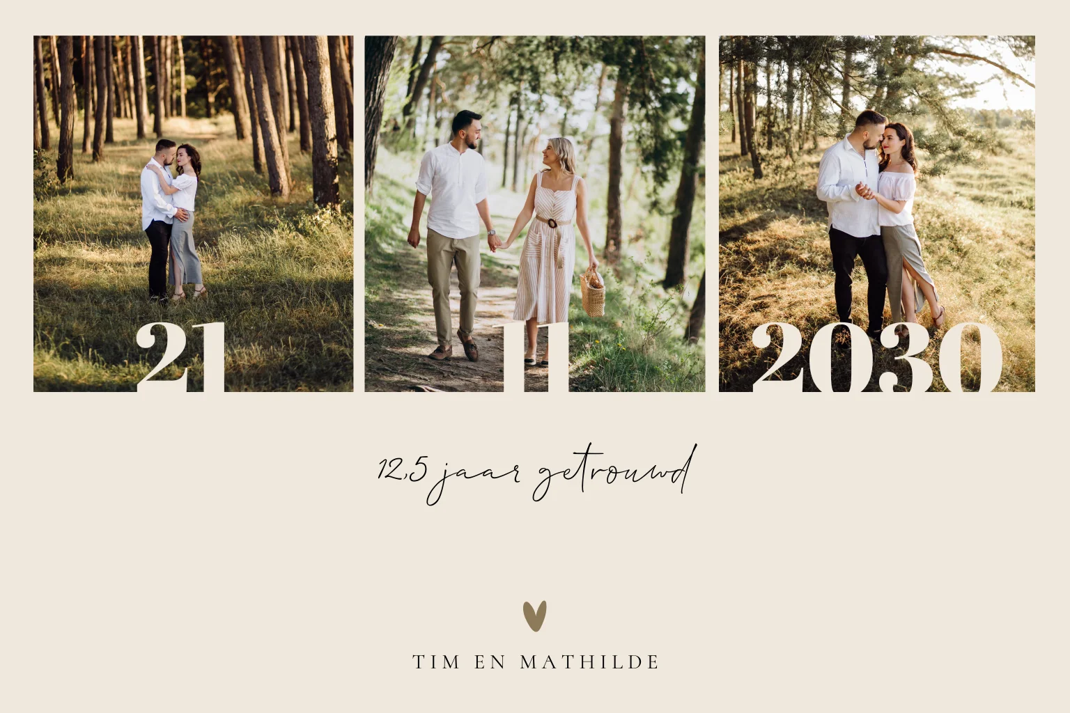 Rechthoekige liggende huwelijksjubileumkaart met ruimte voor meerdere foto’s. Via de online editor pas je de foto’s eenvoudig aan en maak je de kaart helemaal persoonlijk.