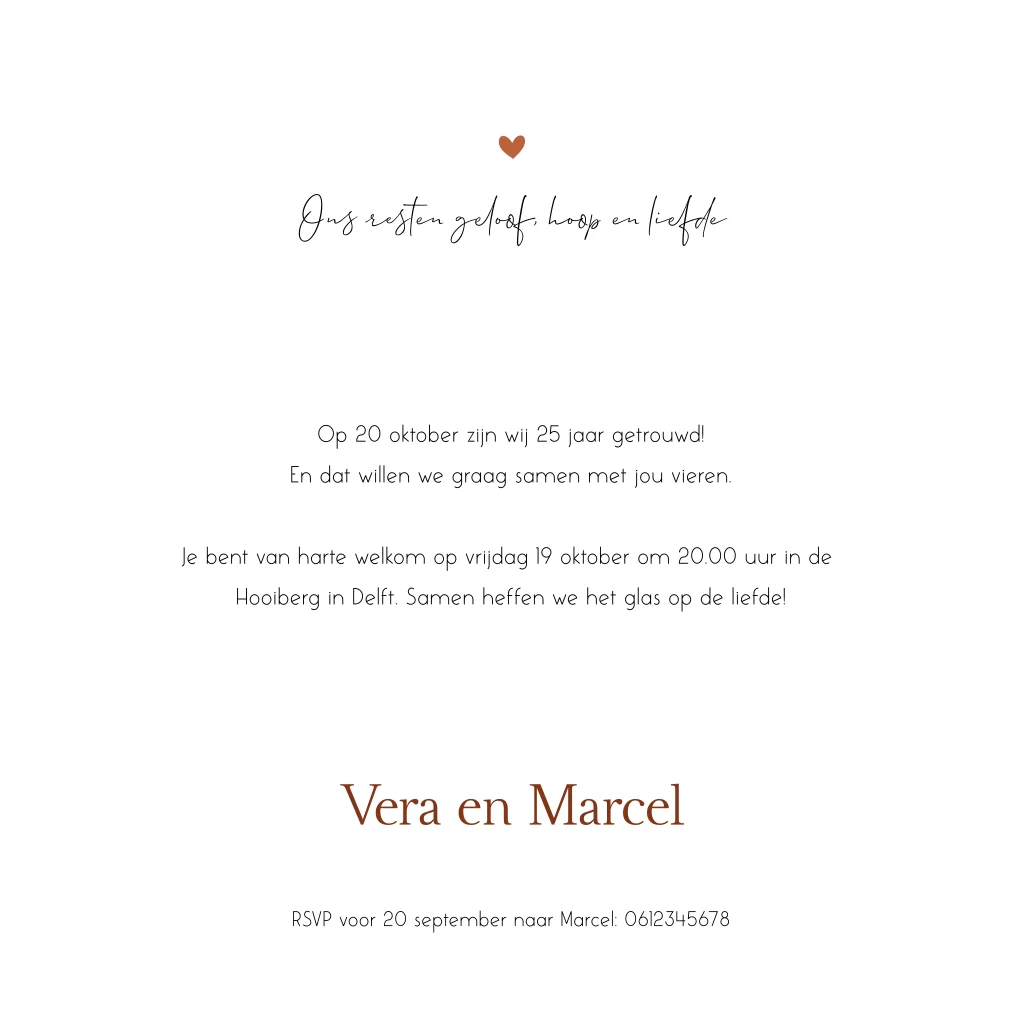 Uitnodiging voor het huwelijksjubileum. Voor het zilveren huwelijk. Pas het jubileum, de tekst en de foto eenvoudig aan in de online editor en bestel zelf online!