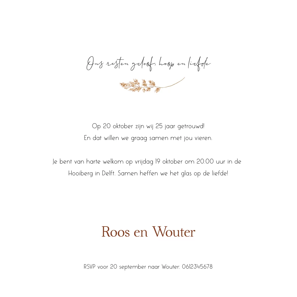 Uitnodiging voor het huwelijksjubileum. Voor het koperen, zilveren of gouden huwelijk. Pas het jubileum en de tekst eenvoudig aan in de online editor en bestel zelf online!