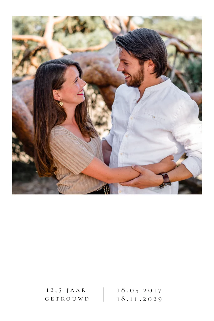 Een minimalistische en originele jubileumkaart voor het huwelijk. Pas de datum, informatie en kleuren zelf aan in de online editor. De voorzijde is voorzien van goudfolie namen.