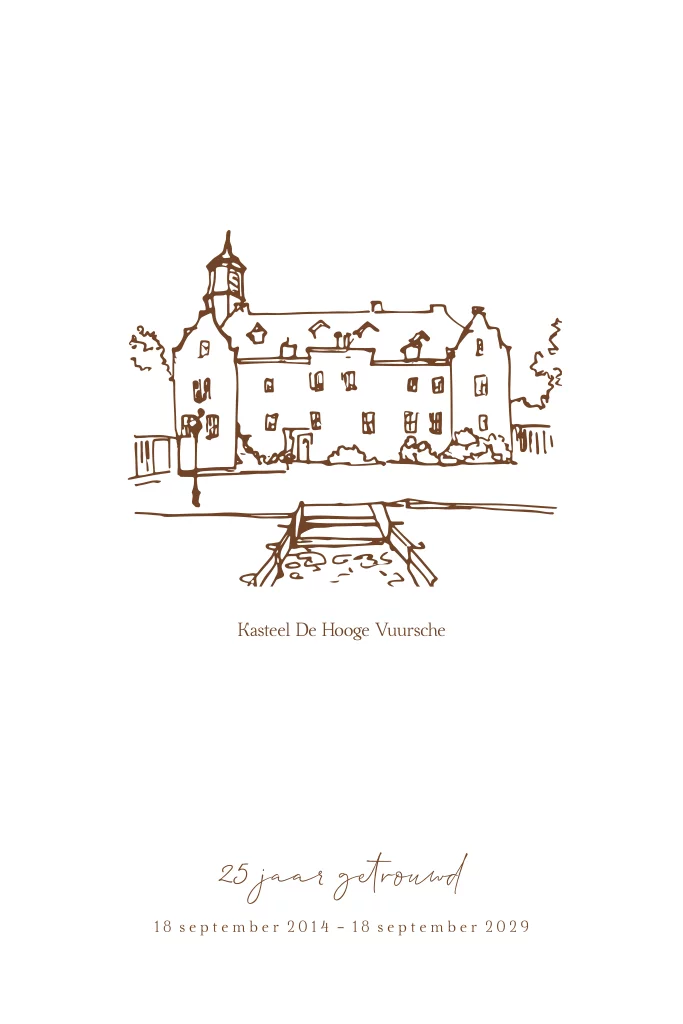 Romantische jubileum kaart met een illustratie van Kasteel De Hooge Vuursche. Wil jij graag een illustratie van jouw feestlocatie op de kaart? Mail ons voor de hulp bij jouw ontwerp.