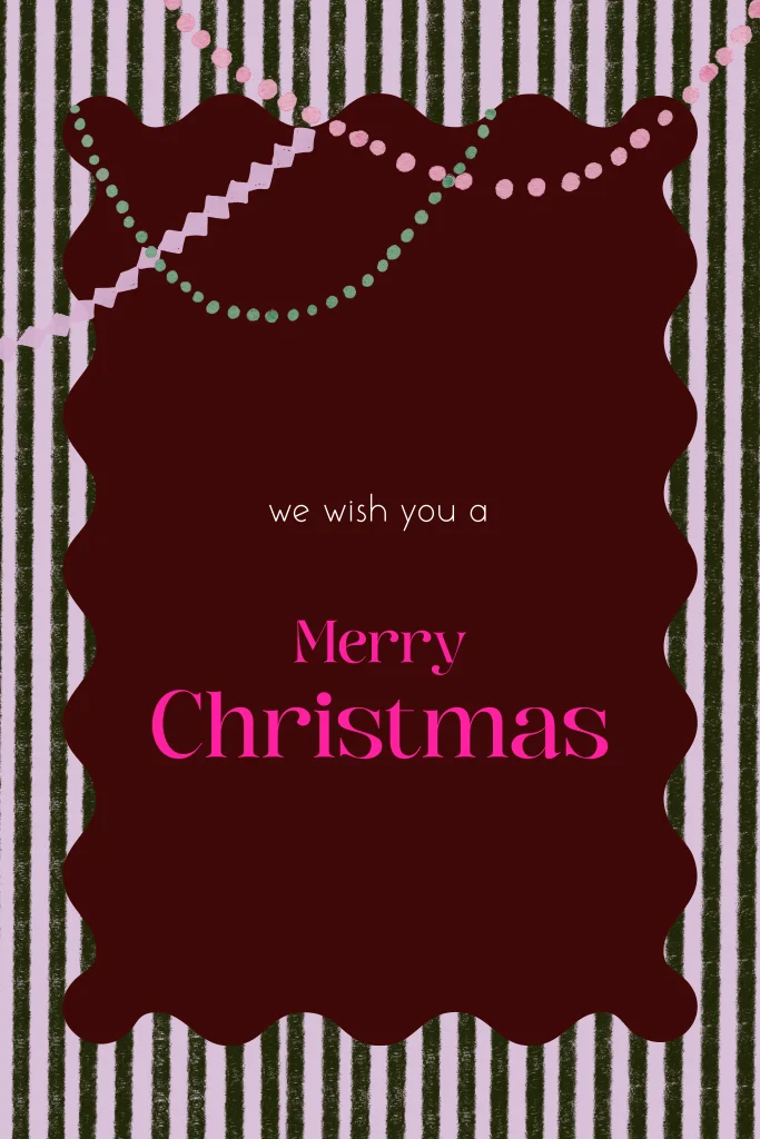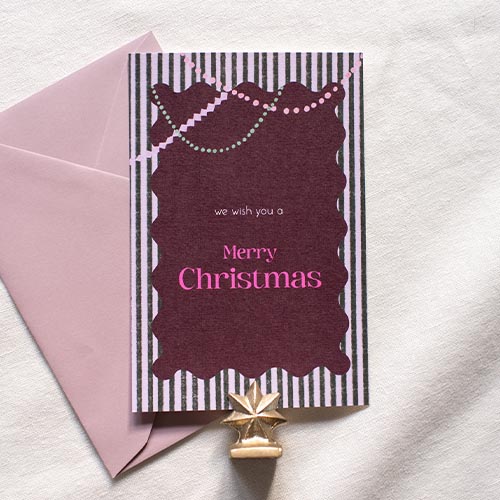 Kerstkaart met vrolijk gekleurde strepen, vormen en slingers. Bewerk de kaart zelf online en bestel jouw zelfgemaakte kerstkaarten.