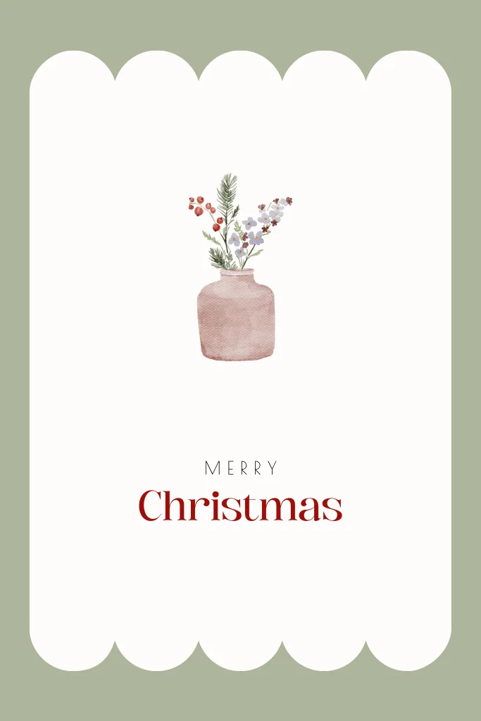 Rustige kerstkaart met vaas met kersttakjes. Bewerk de kaart zelf online en bestel jouw zelfgemaakte kerstkaarten.