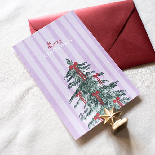 Kerstkaart met vrolijke kerstboom vol rode strikken en een kleurrijke achtergrond met paarse strepen. Bewerk de kaart zelf online en bestel jouw zelfgemaakte kerstkaarten.